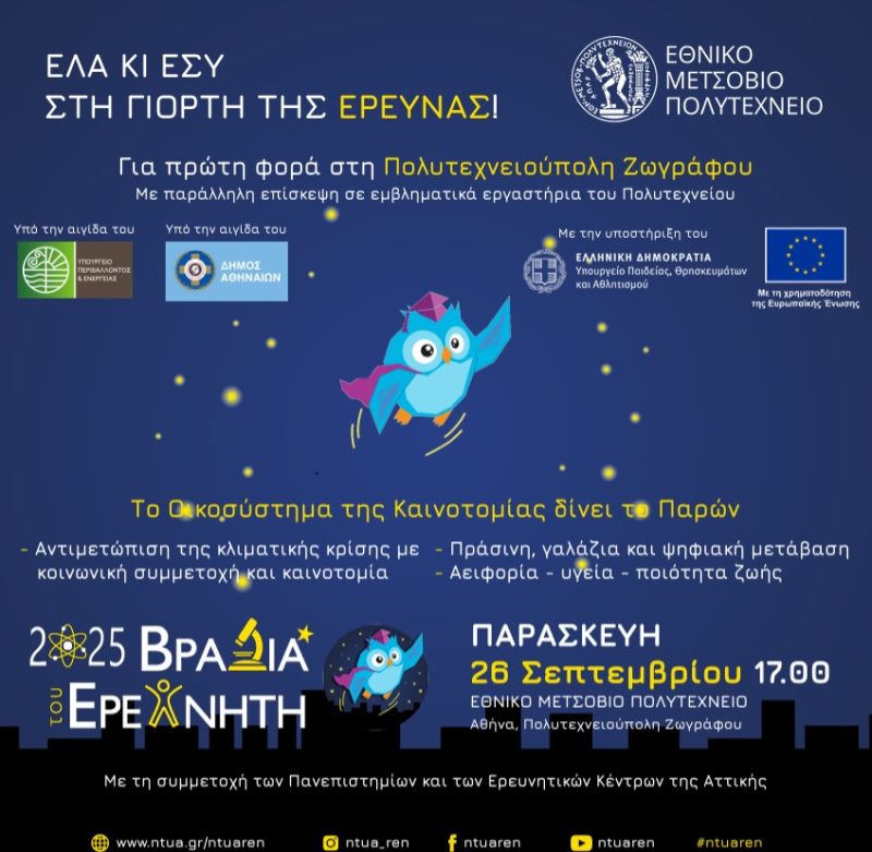 The European Researchers’ Night brings together over two million citizens in more than 350 European cities to celebrate the vital role of research in shaping our future. This year’s event at NTUA will showcase cutting-edge research in topics of great relevance, including the green and digital transition, sustainable development, and addressing the climate crisis with social participation and innovation.